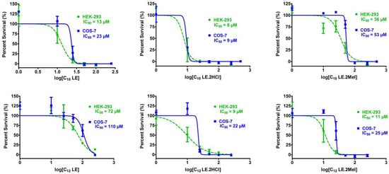 The MIC data shown in Table 1 are for C8 to C14LE derivatives against the non-pathogenic DH5α strain of E. coli in the absence of any additional antimicrobial agent. The MICs shown in the table are artificially limited to 128 µM. Higher concentrations than this can be measured, but at such low potencies for bacteriostatic action, we deem the amphiphile to be inactive. Thus, C8LE (7) was only marginally active against K12 E. coli (MIC = 100 µM) and it was even less active (MIC = 206 µM) against the DH5α strain (data not in Table 1). In general, the MIC results were in concert with earlier reports. Table 1 shows previously reported data for the potencies of lariat ethers having n-octyl, n-undecyl, and n-tetradecyl side chains [48]. Additional data are for lariat ether hydrochlorides and lariat ether methiodides against DH5α E. coli. Since we considered MICs higher than 128 µM as inactive, any MIC higher than that value is reported as 128 µM irrespective of the actual value. C11LE free base is included for comparison in the table, but the protonated and methylated forms were not studied.