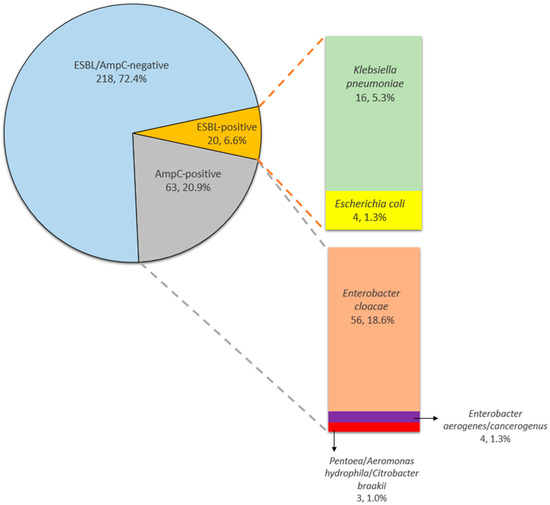 Prevalence of ESBL- and AmpC-producing Enterobacterales and distribution according to bacteria.
