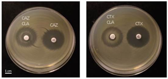 AmpC induction exhibited by disk diffusion with ceftazidime/ceftazidime-clavulanate (CAZ/CAZ-CLA; (left)) and cefotaxime/cefotaxime-clavulanate (CTX/CTX-CLA; (right)) in one representative Enterobacter cloacae strain.