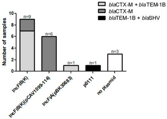 - Ejaz, H.; Younas, S.; Abosalif, K.; Junaid, K.; Alzahrani, B.; Alsrhani, A.; Abdalla, A.; Ullah, M.; Qamar, M.; Hamam, S. Molecular analysis of blaSHV, blaTEM, and blaCTX-M in Extended-spectrum β-lactamase producing Enterobacteriaceae recovered from fecal specimens of animals. PLoS ONE 2021, 16, e0245126. [Google Scholar] [CrossRef]