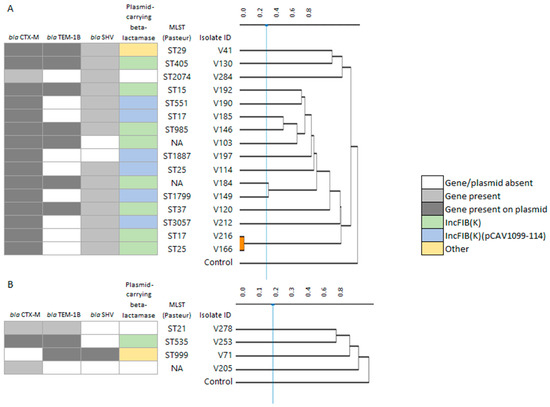 Genotypic and phenotypic characteristics of ESBL-producing isolates. (A) K. pneumoniae isolates and (B) E. coli isolates. The dendrogram on the right displays the relative distance of the isolates according to Fourier-transform infrared (FT-IR) typing.