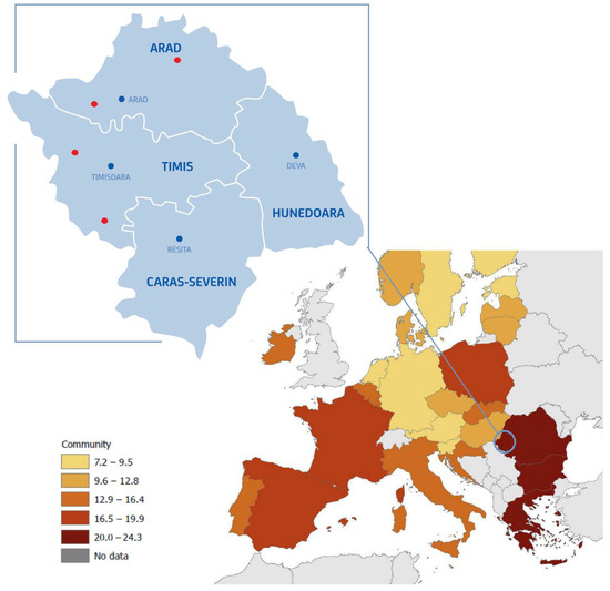 Figure 1. Community consumption of antibacterials for systemic use in EU/EEA countries in 2021 (right) [11] and the geographical area of the study (upperleft—red dots).