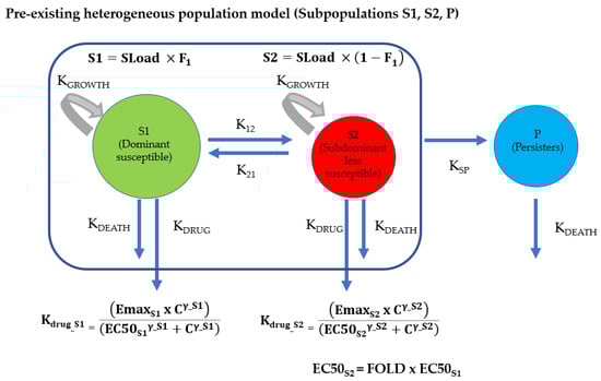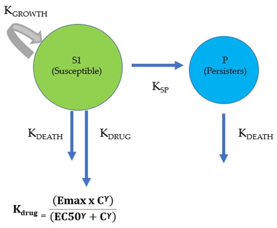 Data from TKCs were analysed using the Phoenix 8.3.0.5005 software package (Certara, Princeton, NJ, USA). A semi-mechanistic model proposed by Nielsen and Frieberg [19] was initially adopted for this study. The model included two compartments: the “S” containing susceptible bacteria, and a second compartment “P”, containing persisters, which are non-growing and drug-insensitive bacteria (Figure 1).