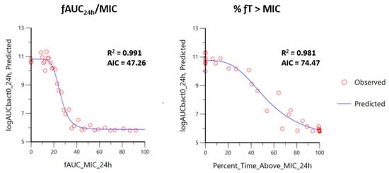 Comparison of fitting for prediction of log10AUCbact0–24h (y axis) obtained from the Imax model, and ƒAUC24h/MIC ((left plot), x axis) or %ƒT > MIC ((right plot), x axis) in a selected isolate (MRSP 41) with an marbofloxacin MIC of 0.25 µg/mL. R2 is the coefficient of determination providing the percentage of variance explained by the model. AIC is the Akaike information criterion, which represents a measure of goodness of fit. In this case, ƒAUC24h/MIC represents the best PK/PD index with the highest R2 and the lowest AIC.