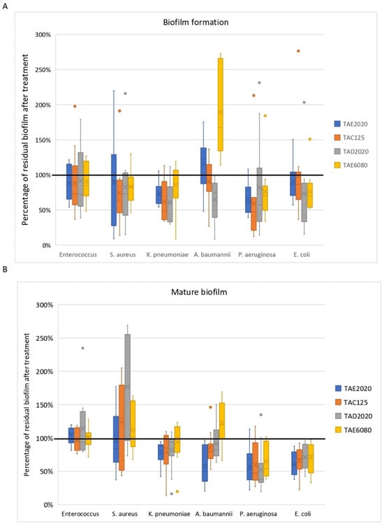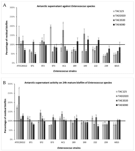 Some supernatants contain molecules active both on biofilm formation and on mature biofilm disaggregation. Undoubtedly, in many cases, different molecules act on the two stages of biofilm formation; for example, supernatants deriving from TAC125 have no activity on biofilm formation by