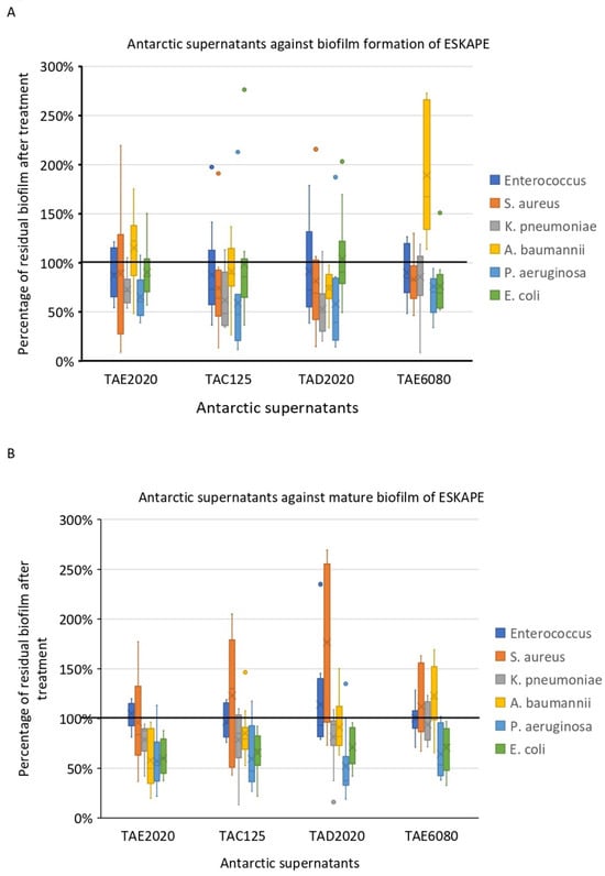 The anti-biofilm effects of Antarctic bacterial-cell-free culture supernatants (SNs) were examined on 60 clinical ESKAPE pathogens either during biofilm development, by adding them to the medium at the beginning of the growth, or after biofilm formation. Firstly, their antimicrobial activity was evaluated to exclude any effect of SNs on bacterial viability; the results did not highlight any antimicrobial activity on all ESKAPE pathogens. On the contrary, SNs were able to prevent biofilm formation and promote the disaggregation of mature biofilm.