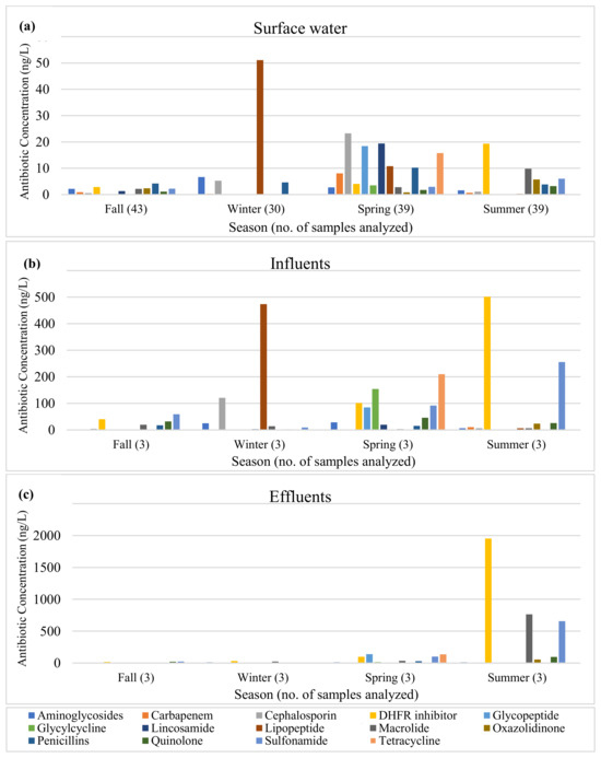 Antibiotic concentrations in (a) surface water, (b) influents, and (c) effluents by antibiotic class.