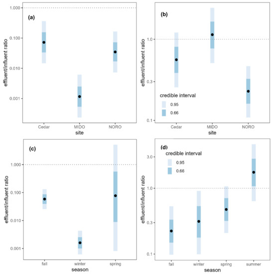 Absolute ARG copy number ratio between wastewater influents and effluents (effluent:influent) (a) by site and (c) by season, and antibiotic concentration ratio between wastewater influents and effluents (effluent:influent) (b) by site and (d) by season. Black points represent the median of the posterior distributions of the effluent:influent ratios. Dotted lines are plotted at a ratio of 1:1 indicating no difference between influent and effluent.