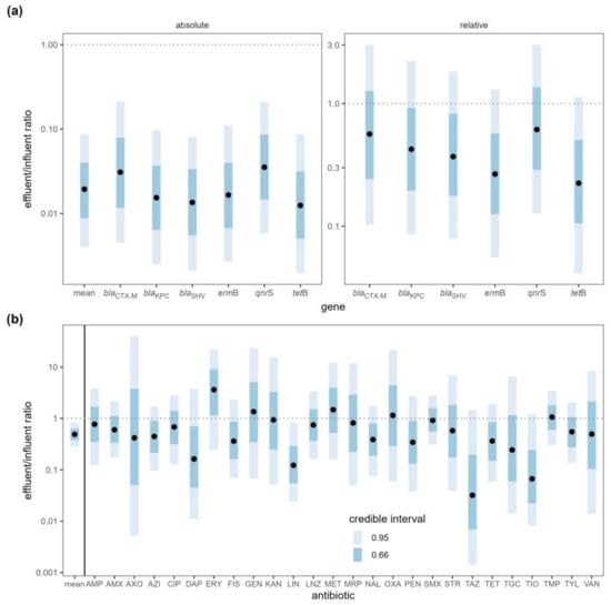 (a) ARG copy number ratio and (b) antibiotic concentration ratio between wastewater influent and effluent samples (effluent:influent). Antibiotics: amoxicillin (AMX), ampicillin (AMP), azithromycin (AZI), ceftriaxone (AXO), ceftazidime (TAZ), ceftiofur (TIO), ciprofloxacin (CIP), daptomycin (DAP), erythromycin (ERY), gentamicin (GEN), kanamycin (KAN), lincomycin (LIN), linezolid (LNZ), meropenem (MRP), methicillin (MET), nalidixic acid (NAL), oxacillin (OXA), penicillin (PEN), sulfamethoxazole (SMX), sulfisoxazole (FIS), streptomycin (STR), tigecycline (TGC), trimethoprim (TMP), tetracycline (TET), tylosin (TYL), and vancomycin (VAN). Black points represent the median of the posterior distributions of the effluent:influent ratios. Dotted lines are plotted at a ratio of 1:1 indicating no difference between influent and effluent.