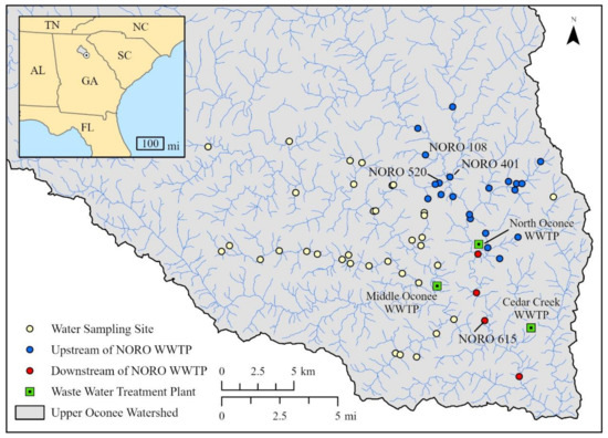 Map of water sampling sites in the Upper Oconee Watershed, Georgia, USA. Wastewater treatment plants (WWTPs) are shown as squares while water sampling sites are shown as circles, with sampling sites upstream of the North Oconee (NORO) WWTP symbolized as blue circles and sampling sites downstream of the NORO WWTP symbolized as red circles.