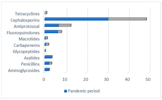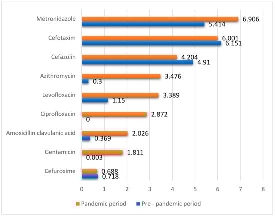 Based on the presented data, it is evident that the pandemic significantly influenced antibiotic usage. As a result, certain classes of antibiotics experienced heightened demand, while the consumption of others declined. Specifically, cephalosporins emerged as the most frequently used antibiotics during the pandemic, with consumption rates surpassing those seen in the pre-pandemic period. In contrast, both macrolides and carbapenems maintained low consumption levels during both the pandemic and pre-pandemic phases (