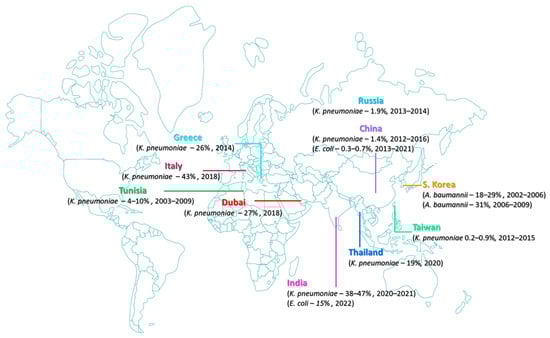 A study in 2022 demonstrated that 15% of carbapenem-resistant Enterobacterales isolates in India showed resistance to colistin [46]. The geographical distribution of significant polymyxin resistance strains is shown in a geospatial map in Figure 1.