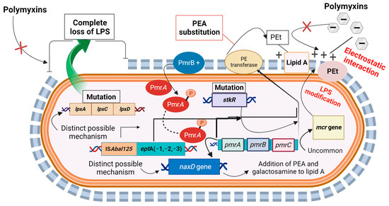 Distinct mechanisms of polymyxin resistance in Acinetobacter baumannii attributed to alterations in either PmrB or the response regulator PmrA, both of which are involved in activating the PmrAB two-component system. This activation leads to the upregulation of the pmrCAB operon and the naxD gene (as distinct pathways). The upregulation of the pmrCAB operon promotes the addition of PEA to lipid A, while the translation of naxD produces NaxD deacetylase, which is required for galactosamine addition to Lipid A. Another distinct possible pathway leading to PEt overproduction in A. baumannii involves ISAbaI insertion element integration upstream of an eptA isoform. Additionally, a mutation in lpxACD causes total loss of LPS Acinetobacter spp., which is a distinctive pathway of polymyxin resistance. Furthermore, a recently discovered novel pathway of polymyxin resistance in A. baumannii involves the deletion of stkR, which significantly increases the expression of pmrA, pmrC, and pmrB and ultimately increases pmrC transcription and the subsequent substitution of lipid A with PEA. Additionally, an uncommon pathway of Lipid A modification involves the mobile colistin resistance gene mcr, which encodes PEt, and the subsequent addition of PEA to LPSs.