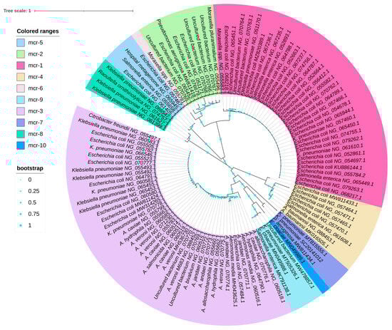 The phylogenetic relationship among the mcr-1 to mcr-10 variants using the neighbor-joining phylogenetic tree using the Kimura parameter with 1000 bootstraps using MEGA10, and visualised using iTOLv5 (Interactive Tree Of Life).
