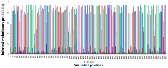 The probability of substitution of nucleotides to mcr-1 is demonstrated in Figure 5, which shows that the most likely substitution of adenine was with guanine (12%), of thymine was with cytosine (15%), of cytosine was with thymine (15%), and of guanine was with adenine (11%). The positions of substitution of nucleotides (A, T, G, and C from position 1 to 262 of different sites) for mcr-1 (E. coli strain ZZ1409 KU886144) are shown in Figure 6, respectively. In terms of positioning, cytosine (C) is predominately present at positions 1 to 257, followed by adenine (A) from positions 1 to 253, guanine (G) from positions 1 to 261, and thymine (T) from positions 5 to 261. In terms of probability and position of substitution, guanine was mostly likely to be present at position 27 with a probability of 0.95, and least likely to be present at position 28 with a probability of substitution of 0.007; thymine was most likely to be present at position 30 with a probability of 0.95 and least likely to be present at position 28 with a probability of 0.007; adenine was most likely to be present at position 220 with a probability of 0.94 and least likely to be present at position 27 with a probability of 0.007; cytosine was most likely to be present at position 160 with a probability of 0.93 and least likely to be present at position 262 with a probability of 0.014.