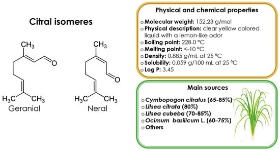 Citral is an acyclic monoterpenoid aldehyde consisting of two geometrical isomers, geranial (citral A, trans-citral, or the E-isomer) and neral (citral B, cis-citral, or the Z-isomer), in a 3:2 ratio. Citral has the chemical formula C10H16O, also known as 3,7-dimethylocta-2,6-dienal []. Figure 1 shows the structural formula of citral isomers and their main physical and chemical properties []. This monoterpene is found in different plants, citrus fruits, herbs, and grasses, being one of the most common essential oils (EOs) of Cymbopogon species, mainly East Indian (C. flexuosus) and West Indian species (C. citratus), commonly known as lemongrass, with a citral content of 70–85% [,].