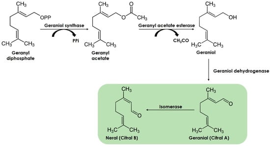 Citral is biosynthesized from geranyl diphosphate (GPP) molecules after various secondary transformations such as isomerization and acetylation, deacetylation, cyclization, and dehydrogenation (Figure 2) [].