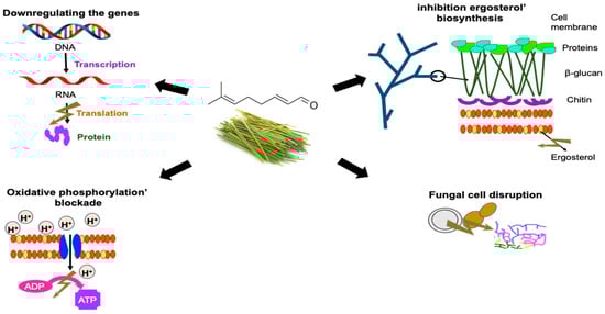 Cai, Hu [] investigated the antifungal activity and mechanism of citral and other terpenes against Zygosaccharomyces rouxii, with citral showing the most potent antifungal effect. The antifungal effect can be attributed to the alteration of the integrity and permeability of the cell membrane, which can cause irreversible damage to the cell wall and membrane. They can also destroy yeast proteins and inhibit their synthesis. The results have indicated that EOs can effectively inhibit the growth of food-related microorganisms, and there is great potential for applying EOs to the food industry. The authors mention that the effect of terpenes on the germination capacity of Z. rouxii spores should be studied. On the other hand, the possible antifungal mechanism of citral against Candida albicans (a yeast that inhabits the human body in a commensal way and can cause opportunistic or pathogenic infections) has also been investigated. The MIC (64 µg/mL) and MFC (256 µg/mL) of citral required only 4 h of exposure to effectively kill 99.9% of the inoculum. Citral’s mechanism of action did not involve the cell wall or ergosterol (Figure 3). However, in the morphological interference test, the product inhibited the formation of pseudohyphae and chlamydoconidia.