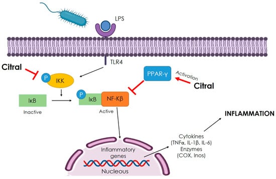 The anti-inflammatory mechanism of citral is attributed to the inhibition of NF-κβ signaling. Citral activates peroxisome proliferator-activated receptor (PPAR-γ) and inhibits IκB phosphorylation, which independently blocks NF-κβ activity with the consequent inhibition of gene expression of the inflammatory mediator [,,,,].
