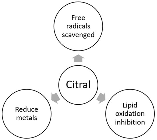 The antioxidant activity of citral has been previously explored (Figure 6). In this way, different studies have demonstrated that citral can scavenge the DPPH radical, presenting IC50 values between 6.9 and 3700 µg/mL [,,]. A study performed by Xu, Zhu [] found that citral exhibited the ability to stabilize the DPPH radical (IC50: 67.31 mg/mL) and reduce power (concentration of 2 to 10 mg/mL of citral showed an absorbance value between 0.15 and 0.55; high concentration means high absorbance). Bouzenna, Hfaiedh [] also reported the capacity of citral to stabilize the DPPH radical (EC50: 263.33 µg/mL) and reduce metals (FRAP, EC50: 125 µg/mL), as well as the capacity to inhibit the oxidation of linoleic acid (β-carotene/linoleate system, inhibition of 71.27%). In the same regard, Guimarães, dasGraças Cardoso [] tested the capacity of citral to inhibit the DPPH radical and linoleic acid oxidation at a concentration between 5 and 100 µg/L. DPPH results showed that citral had a low antioxidant effect (inhibition lowest to 1.10%). However, the evaluated compound could inhibit linoleic acid oxidation (inhibition between 5.6 and 38%). Wang, Jiang [] studied the antioxidant potential of citral by several methods. The reduction potential showed a dose-dependent effect, presenting absorbance values between 0.8 and 1.9 at a dose between 0.05 and 0.40 mg/mL. In addition, citral effectively stabilizes the superoxide (IC50: 0.67 mg/mL) and hydroxyl (IC50: 0.5 mg/mL) radicals. Additionally, citral presented the potential to inhibit lipid peroxidation based on the ferric thiocyanate method, where the analyzed compound at 1 mg/mL reduced linoleic acid oxidation by 47% after 8 days of incubation compared to the control (without citral). The thiobarbituric acid (TBA) method demonstrated that citral reduced malonaldehyde formation by 81%, compared with control (without citral).