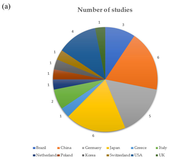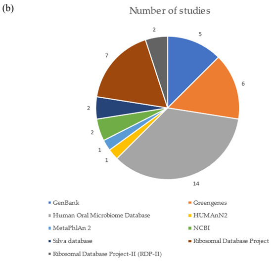 The studies that included in the current review originate from different countries (Figure 3a), for example, Japan [21,49,55,57], China [36,42,48,52,60], United States of America [22,25,45,50], United Kingdom [47], Germany [38,43,46,53], and The Netherlands [37]. It is significant to note that certain sections of the globe are not represented here. This may also be due to the exclusion of articles written in other languages. Hence, the current data may be significantly influenced by the diet and genetic make-up of the individuals from the representative countries [61]. The characterization of oral dysbiosis in different ethnicities and races presents significant challenges due to variations across multiple studies [62,63,64]. This is due to the highly varied diet, nutrition and lifestyle practices present over several generations in different geographical locations [65,66].