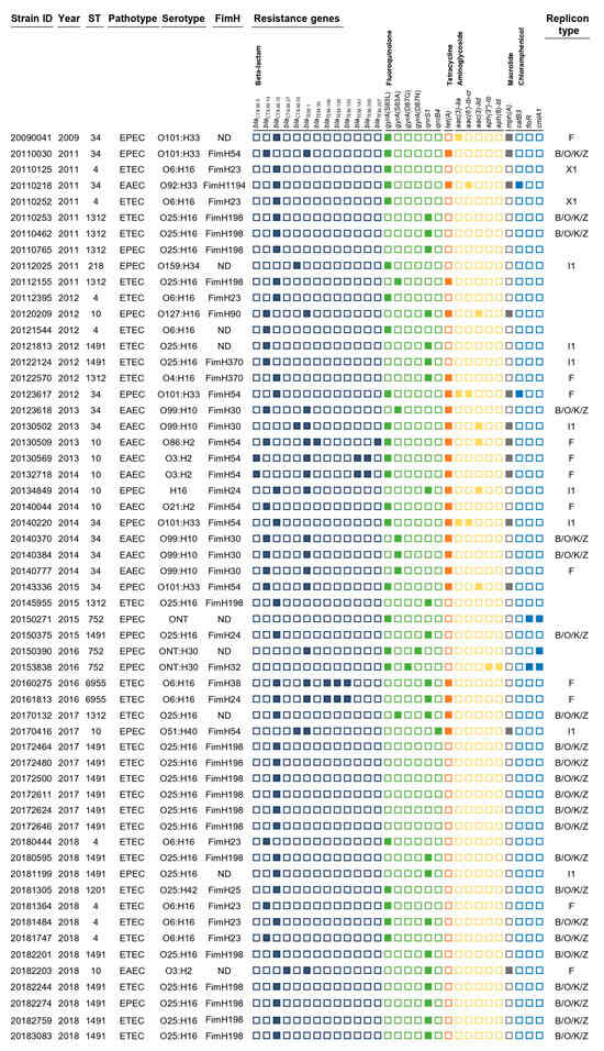 During the study period (2008–2018), 4212 E. coli isolates were obtained by the national surveillance system (Enter-Net and Pulse-Net Korea). These isolates were collected from stool or rectal swabs from patients with gastrointestinal symptoms, including diarrhea, abdominal pain, vomiting, nausea and fever.