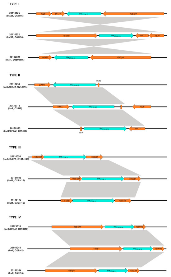 Four different structures (type I (10 isolates), type II (23 isolates), type III (3 isolates) and type IV (9 isolates)) were identified regarding the genetic elements of blaCTX-M (Figure 2).