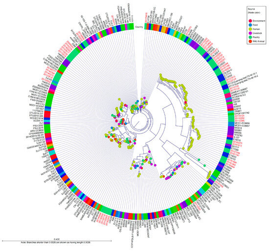 Whole-genome SNP-derived phylogenetic tree of CC10 isolates in a global context. The tree includes 265 international E. coli CC10 sequences, including the reference sequence of E. coli K-12 MG1655. The diagram depicts a phylogenetic tree with a genome alignment of the 14,260 SNPs for 265 global CC10 strains, including all publicly available isolates from EnteroBase. The node color represents the source of the isolates, and the colored ring around the tree indicates the country where the isolates were collected. Red colored names indicate the strains were isolated in the Republic of Korea. Isolate names colored black indicates that the strains isolated in other countries.