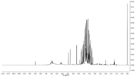 A known amount of dried extract of V. vinifera seeds was resuspended in 700 μL of D2O containing 3-(trimethylsilyl)-propionic-2,2,3,3-d4 acid sodium salt (TSP) as an internal chemical shift and concentration internal standard at a final concentration of 2 mM. The NMR experiments were carried out at 298 K on a JNM-ECZ 600R (JEOL Ltd., Tokyo, Japan) spectrometer operating at the proton frequency of 600 MHz and equipped with a multinuclear z-gradient inverse probe head, and the monodimensional 1H spectra were acquired employing a presat pulse sequence, 64 k data points, a spectral width of 15 ppm (9.03 kHz), a recycle delay of 5.72 s, a presat time of 2 s and an acquisition time of 5.81 s. The spectra were processed with an exponential window function of 0.1 Hz and phase-corrected, and then the baseline was optimized with the Akima algorithm. Resonance assignment was carried out on the basis of resonance chemical shift, multiplicity, software database (Chenomx 9.0, Chenomx Inc., Edmonton AB, Canada) and literature data [78,79].