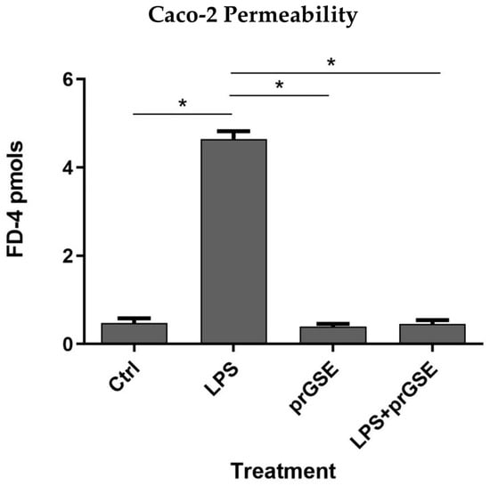 The barrier function of the Caco-2 cell monolayers was evaluated through the FD-4 (fluorescein isothiocyanate-dextran) permeability assay. LPS treatment (10 µg/mL) for 24 h, prGSE (6.25 µg/mL) for 24 h and LPS with prGSE treatment for 24 h. The experiments were repeated in triplicate. Data are reported as mean ± SD. Statistical analysis was performed using a two-way ANOVA, followed by Bonferroni’s post-hoc correction test. * p < 0.05. Ctrl (control); LPS (lipopolysaccharide); prGSE (procyanidins-rich grape seed extract); prGSE+LPS (mix).