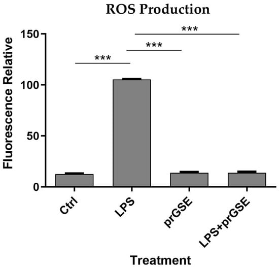 Reactive Oxygen Species (ROS) analyses were performed using carboxy-H2DCFDA staining by a fluorescence plate reader. The experiments were executed in triplicate. Data are reported as fluorescence relatives. The experiments were executed in triplicate. Data are reported as mean ± SD. Statistical analysis was performed using a two-way ANOVA, followed by Bonferroni’s post-hoc correction test *** p < 0.0001. Ctrl (control); LPS (lipopolysaccharide); prGSE (procyanidins-rich grape seed extract); prGSE+LPS (mix).