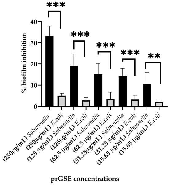 Percentage of inhibition biofilm formation of E. coli ATCC 25922 and S. Typhimurium ATCC 14028 with scalar concentrations of procyanidins-rich grape seed extract (prGSE) (250 µg/mL, 125µg/mL, 62.5 µg/mL, 31.25 µg/mL and 15.65 µg/mL) after 24 h of incubation. ** p < 0.01; *** p < 0.001.