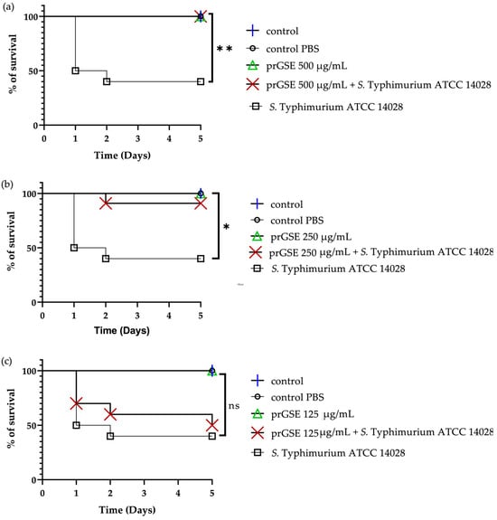 Survival curves of G. mellonella larvae infected with S. Typhimurium ATCC 14028 and treated with 500 µg/mL (a), 250 µg/mL (b), and 125 µg/mL (c) of procyanidins-rich grape seed extract (prGSE). PBS = Phosphate-Buffered Saline. The Mantel–Cox log-rank test was used to judge the statistical significance relative to the control. * p < 0.05 compared to the control; ** p < 0.01 compared to the control; ns = not significant.