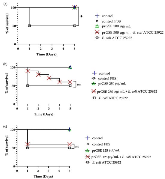 Survival curves of G. mellonella larvae infected with E. coli ATCC 25922 and treated with 500 µg/mL (a), 250 µg/mL (b) and 125 µg/mL (c) of procyanidins-rich grape seed extract (prGSE). PBS = Phosphate Buffered Saline. The Mantel–Cox log-rank test was used to judge the statistical significance relative to the control. * p < 0.05 compared to the control; ns = not significant.