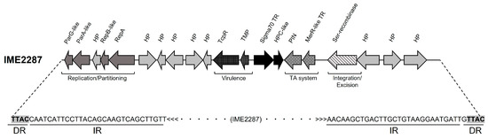 Genetic structure of IME2287. IME2287 carries its own replication and partitioning machinery (dark grey) comprised of ParG-like, ParA-like, RepB-like, and a RepA proteins in the same operon and excision/integration capacities via a serine recombinase (white with grey lines). Other exciting genes in IME2287 include the following: a putative virulence operon (black with white polka dots) composed of a Toll/interleukin-1 receptor protein (TcpR) and a transmembrane protein (TMP) and a putative toxin–antitoxin system containing a PIN domain-containing protein (toxin) and a MerR-like DNA binding protein (antitoxin). See text and Table 2 for other IME2287 components. DRs, direct repeats, (shaded) at the junction with genomic DNA and adjacent inverted repeats (IRs) comprise the TTAC sequence targeted by IME2287. This figure was produced using SnapGene Viewer v7.0.3 (www.snapgene.com) and manually edited with Microsoft PowerPoint for Mac v16.78.3.