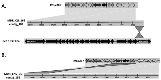 (A) IME2287 insertion in R. equi chromosome. Above, IME2287 with ORFs are represented by arrows. In the middle, contig 182 from MDR clinical isolate 169 (GenBank accession no. SAMN13392202). Below, a portion of the Rhodococcus equi 103S chromosome (ORFs are represented by black arrows; GenBank accession no. FN563149.1). (B) Example of IME2287 duplications. Above, IME2287 with ORFs represented by arrows. Below, the environmental MDR isolate 36 (GenBank accession no. WVCU00000000). Regions with significant similarity (nBlast, Score matrix Blosum62) are connected by colored lines (light grey, sequences in direct orientation; dark grey, sequences in reverse orientation). All connecting lines between sequences represent a percentage of identity > 97%. This figure was produced using the Artemis Comparison Tool (ACT) [44] and manually edited with Microsoft PowerPoint.