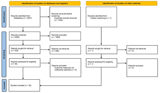 After applying the search strategy described under “Materials and Methods”, 3051 articles were identified. Overall, 1042 records were duplicates and were removed before screening, 2009 articles were screened, and ultimately 40 articles were assessed for final eligibility. In total, 6 articles recorded the investigated outcome measures insufficiently and had to be excluded, leaving 34 studies for inclusion in the meta-analysis.