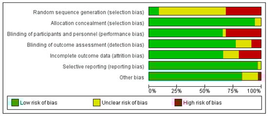 The included studies were evaluated for methodological flaws using the Cochrane Collaboration’s risk of bias assessment tool (Review Manager version 5.3). Seven domains of risk of bias were assessed for each study, including random sequence generation, allocation concealment, blinding of participants and personnel, blinding of outcome assessment, incomplete outcome data, selective reporting, and other bias. Bias assessment was performed by two of the authors independently (A.J., A.A.E.H.). Validation and further formatting in the above-mentioned assessment software was performed by a third author (S.H.).