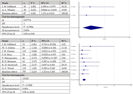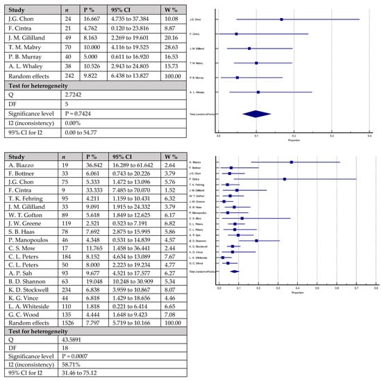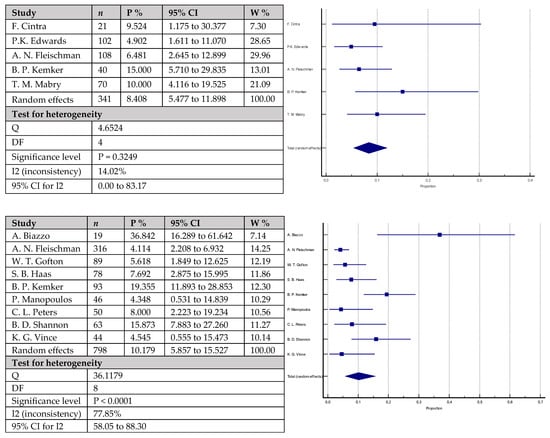 Forest plots showing rates of instability. The upper chart represents data from studies involving patients with cemented stem fixation and the lower chart represents data from studies with cementless stem fixation fixation (n—sample size, P %—Proportion, CI—Confidence interval, W %—Weight (Random)) [25,26,28,29,37,43,44,46,49].