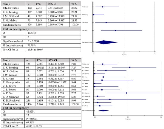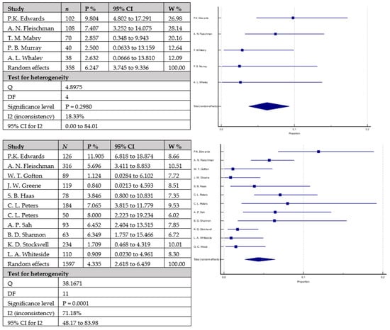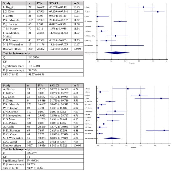 Forest plots showing rates of aseptic loosening. The upper chart represents data from studies involving patients with cemented stem fixation and the lower chart represents data from studies with cementless stem (n—sample size, P %—Proportion, CI—Confidence interval, W %—Weight (Random)) [22,23,25,26,28,29,36,37,40,41,42,43,44].