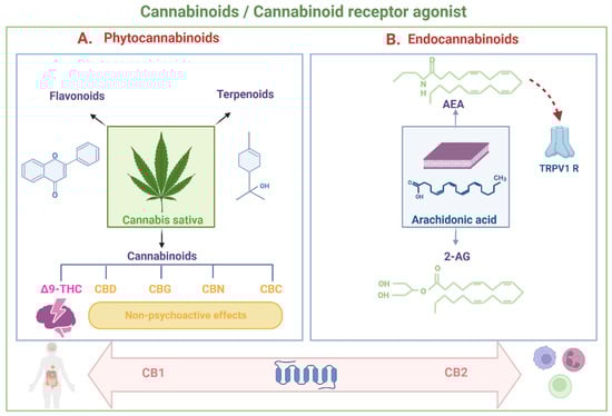 Cannabinoids derived from the cannabis sativa plant are known as phytocannabinoids, including the psychoactive component Δ9-tetrahydrocannabinol (Δ9-THC), cannabidiol (CBD), cannabigerol (CBG), cannabinol (CBN), and cannabichromene (CBC), which lack such effects. Flavonoids and terpenoids constitute other bioactive molecules contained in the plant; terpenoids are secondary metabolites with organoleptic properties that give them differential properties (A). Endocannabinoids (compounds produced naturally by the human body) belong to the eicosanoid group, and its two main representatives are anandamide (arachidonoyl ethanolamide-AEA), and 2-arachidonoylglycerol (2-AG), which act as cannabinoid receptor agonists. Both phytocannabinoids and endocannabinoids act on the cannabinoid receptors CB1 and CB2. CB1 receptors are widely distributed in the human body, with high expression in the central nervous system, while CB2 receptors are mainly found in the cells of the immune system (B).
