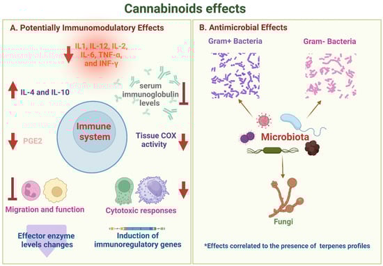 Cannabinoids have been observed to decrease the release of pro-inflammatory cytokines such as IL1, IL-12, IL-2, IL-6, tumor necrosis factor α(TNF-α), and interferon-gamma (IFN-γ) while increasing the production of anti-inflammatory cytokines associated with the control of the inflammatory process, including IL-4 and IL-10 [,]. Additionally, cannabinoids can reduce prostaglandin E2 and tissue cyclooxygenase (COX) activity and suppress serum immunoglobulin levels [].