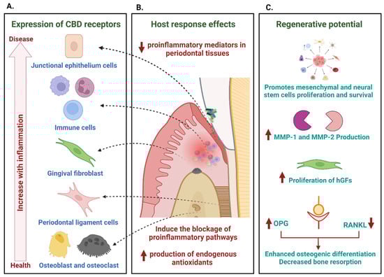 The expression of CB1 and CB2 cannabinoid receptors in periodontal tissues (junctional epithelium, immune response cells, gingival and periodontal ligament fibroblasts, osteoblasts, and osteoclasts) and the increase in their expression in the presence of inflammation are a clear indication of a possible role in modulating the host response (A). Through their activation, cannabinoids mediate anti-inflammatory and regulatory responses, decreasing mediators of inflammation in periodontal tissues and inducing the blocking of pro-inflammatory pathways (B). The modulation of these responses goes hand in hand with a range of actions that promote the repair and regeneration of tissues, which include the promotion of the proliferation and survival of stem cells, the increase in the production of metalloproteinases, hand in hand with the proliferation of gingival fibroblasts (hGFs) and anabolic functions of bone metabolism mediated by their activity in the RANK–RANKL–Osteoprotegerin (OPG) system, which results in an increase in osteogenic differentiation and a decrease in bone resorption (C).