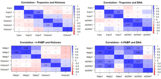 Elevated levels of IL-1 were observed on admission, with significant decreases until day 7. It was similarly observed in the pneumococcal and non-pneumococcal subgroups, although, in the latter subgroup, the decrease did not achieve significance, possibly due to a type 1 error. No significant differences were observed between the subgroups. A significant increase in circulating histones was observed from admission to day 7. This trend was similar in both subgroups, but in the non-pneumococcal subgroup, this increase did not reach significance. No significant differences were observed between subgroups, although, on day 7, the difference was borderline significant. A significant reduction in circulating DNA levels was observed from admission to day 7 in the overall population and subgroups, with no differences between the subgroups regarding the days of observation (Table 3). When performing the correlations between the biomarkers of cell damage (histones and DNA) and the biomarkers of acute myocardial damage (Tn and h-FABP), only positive and significant correlations were observed between h-FABP and DNA on day 1 (r = 0.74; p < 0.01) and day 3 (r = 0.83; p < 0.01) (Figure 1).