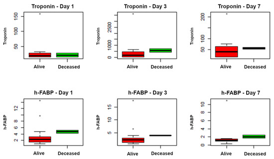 Correlation between biomarkers of myocardial damage (Troponin and h-FABP) and mortality at day 1, day 3, and day 7.