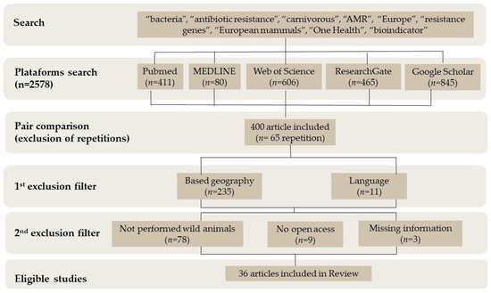 The initial search identified 2578 articles on the databases (ResearchGate, MEDLINE, PubMed, Web of Science, and Google Scholar) using the terms “bacteria”, “antibiotic resistance”, “carnivorous”, “AMR”, “Europe”, “resistance genes”, “European mammals”, “One Health”, and “bioindicator”. On the 2578 articles collected, a first screening was performed based on the information in the abstracts. A total of 2178 were excluded since they did not have the necessary information for the review. From the remaining 400, 65 were duplicates and therefore excluded. Another 235 were excluded due to geography (studies performed outside Europe). Eleven were removed due to language, since only English, Spanish, and Portuguese manuscripts were included in this review. With a secondary exclusion filter screening the full articles, 78 were excluded since they were not performed in wild animals or did not include all the information required, and 9 were not open-access full articles. Therefore, a total of 36 articles had all the information required and were included in this review (Figure 1). Table 2, Table 3, Table 4 and Table 5 is presented the information from the papers selected.