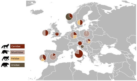 Concerning the available data, it is possible to observe that most studies were conducted on small mammals (Figure 3), mainly from the Mustilidae family. This may be associated with the fact that large carnivore populations (wolf, bear, wolverine, lynx) have declined in Europe and their numbers are very small [62,73]. Most of these populations are threatened and protected by law [34,52]; therefore, it is necessary to access samples from these individuals to carry out studies [37,74]. In addition to being threatened, some species, such as polar bears, live in very remote areas, difficult to access and with harsh climates [25,50].