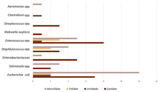 The most observed species of bacteria were E. coli and Enterococcus spp. (Figure 3) in general in the four families of carnivores. E. coli prevailed in all families except Felidae, where Enterococcus spp. was the most prominent bacterial species. The results were expected since most samples originated from feces or rectal swabs [52,72].