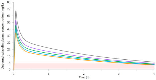 Illustration of concentrations following a 2 g bolus dose of cefazolin prophylaxis, where the grey line represents 60 kg (BMI 21), the purple line represents 90 kg (BMI 31), the green line represents 120 kg (BMI 42), the blue line represents 150 kg (BMI 52), and the orange line represents 180 kg (BMI 62). The shaded area is the range of investigator-selected MIC thresholds (i.e., 1 mg/L to 8 mg/L) used to determine %ƒT>MIC and evaluate cefazolin doses in the PK studies included in the systematic review by Coates et al. [59].