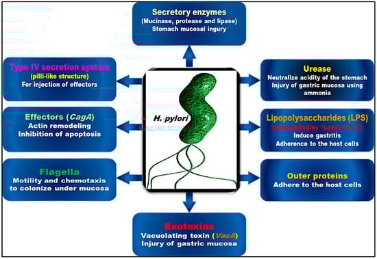 H. pylori also has virulence traits that enable it to change the surroundings for its own benefit in addition to weapons that directly affect host cells and adhesive components that let it adhere to its host []. Several virulence factors related to pathogenicity aid adhesion as well. There is evidence that the BabA-LeB interaction activates the type IV secretion system (T4SS), which is a pilus-like structure that permits the transfer of regulatory proteins such as cytotoxin-associated gene A (CagA) and vacuolating cytotoxin A (VacA) []. Direct attachment of epithelial cells to integrin-1 is required for CagA to attach to and disrupt the signal transduction pathways of H. pylori []. The VacA protein directly interacts with a number of targets and has a number of downstream effects. In persistent infections, the VacA protein plays a crucial role in avoiding the immune response. It is mainly a pore-forming toxin that abruptly kills host cells. The latter function is accomplished by hindering phagocytosis and creating cytoplasmic vacuoles in the host cell where H. pylori can live. Toxins are the most important virulence factors of H. pylori and are essential to its virulence. In most strains of H. pylori, VacA is produced, whereas CagA is present in only a few strains. In fact, CagA positivity has been linked to more serious infections, poorer treatment outcomes and a greater likelihood of developing cancer in the future []. Although these two proteins are the main contributors to the pathogenesis of H. pylori infection, other proteins also play an integral role in attachment, immune evasion, and inflammation [,].
